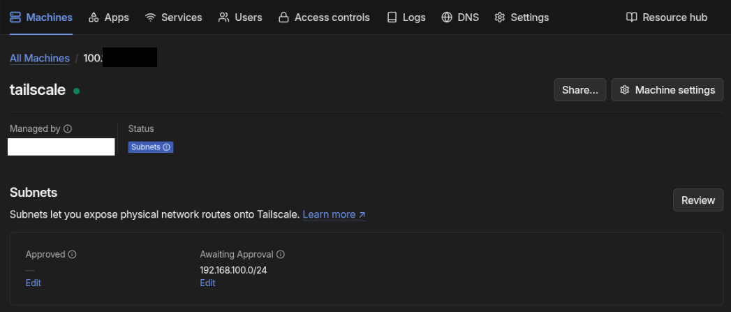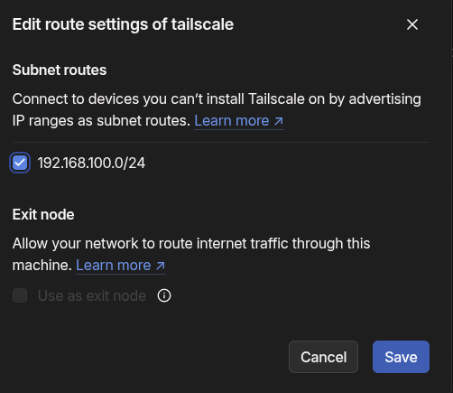 sudo tailscale up --advertise-routes=192.168.100.0/24 --accept-routes