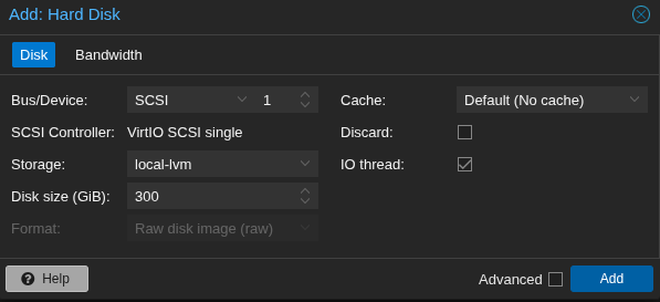 Under my immich server’s hardware, I’ll add a 300GB drive for storing all application data and photos.