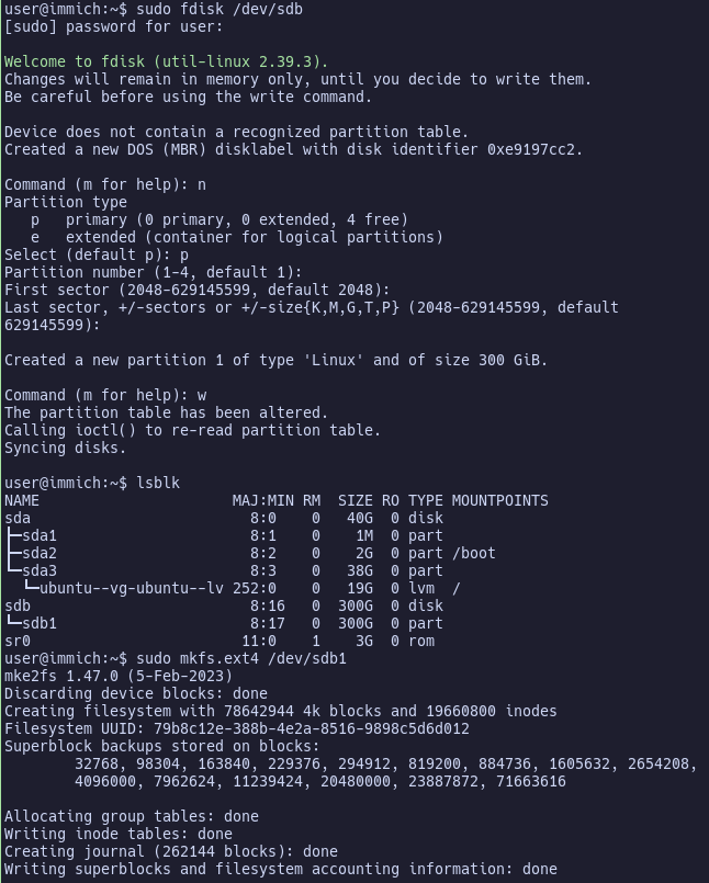 user@immich:~$ sudo mkfs.ext4 /dev/sdb1